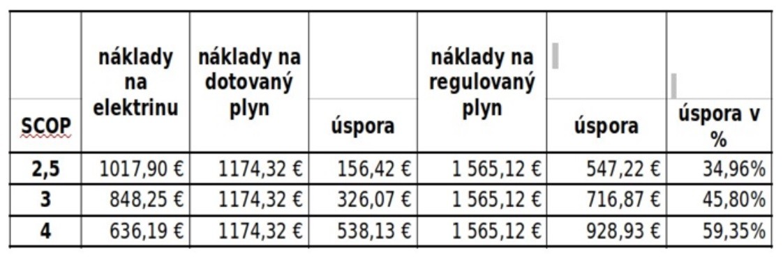 Ako vidieť, aj pri dotovanej cene plynu je vykurovanie tepelným čerpadlom pre daný dom lacnejšie, dokonca pri regulovanej (nedotovanej) cene a priemernej ročnej účinnosti tepelného čerpadla 3, je úspora pri použití tepelného čerpadla takmer 50 % nákladov.