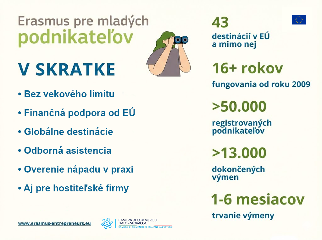 Na Slovensku je prístup k programu zabezpečovaný prostredníctvom akreditovaných sprostredkovateľských organizácií. Medzi ne patrí aj Taliansko-Slovenská obchodná komora so sídlom v Bratislave, ktorá v rámci programu Erasmus pre mladých podnikateľov pôsobí ako sprostredkovateľská organizácia už viac ako 15 rokov. Komora zabezpečuje podporu výmenných pobytov v rámci celej Európskej únie aj v globálnom kontexte, pričom jej činnosť nie je teritoriálne obmedzená len na spoluprácu medzi Talianskom a Slovenskom. Poskytuje odbornú asistenciu pri príprave žiadostí, vyhľadávaní vhodných podnikateľských partnerov a realizácii podnikateľských mobilít v Európe aj mimo nej. Ďalšie informácie sú dostupné na oficiálnych stránkach programu Erasmus pre mladých podnikateľov a Taliansko-Slovenskej obchodnej komory