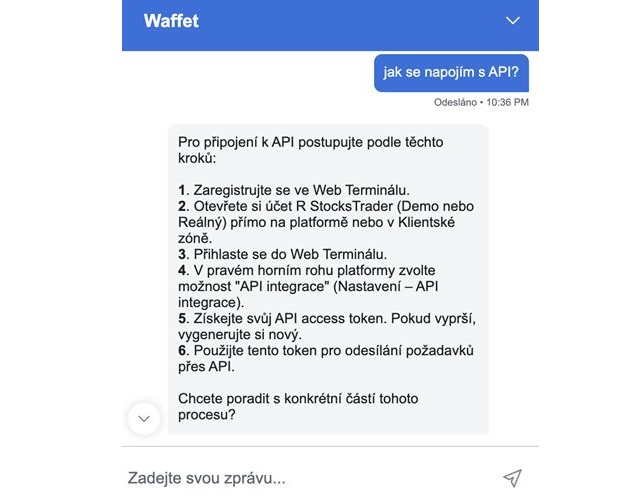 Príkladom môže byť otázka na Waffeta, ako sa pripojiť k API.