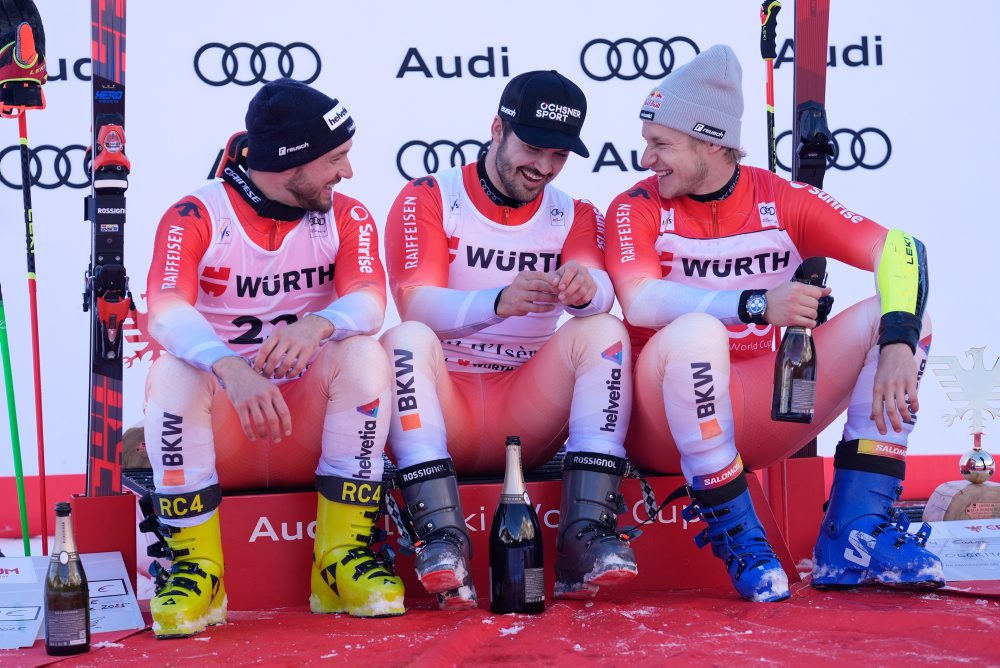 Na snímke zľava strelec druhého gólu Andrej Šťastný a jeho asistent Žiga Jeglič (obaja Slovan) v hokejovom zápase KHL medzi HC Slovan Bratislava - Avtomobilist Jekaterinburg 19. októbra 2015 v Bratislave.