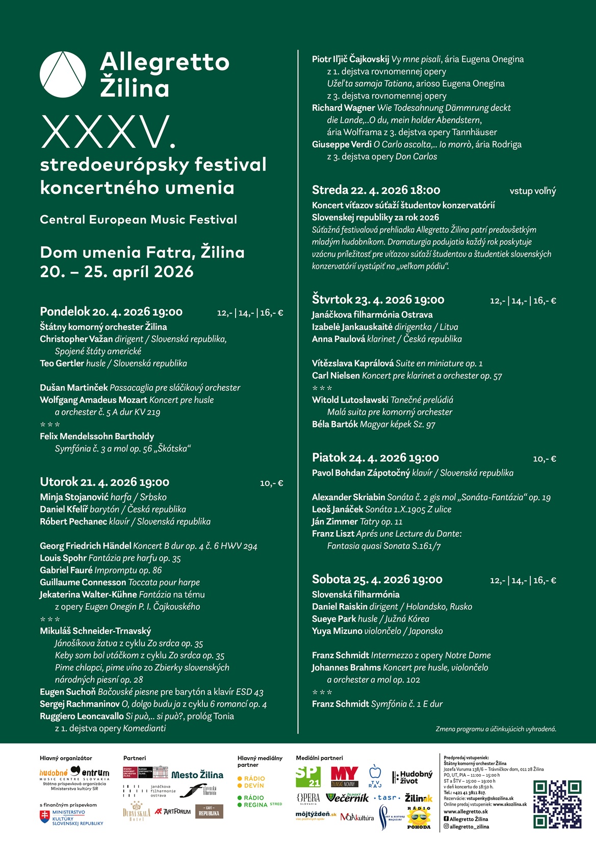 Partneri: Konzervatórium Žilina, Janáčkova filharmónia Ostrava, Slovenská filharmónia, Hotel Dubná Skala a ď..