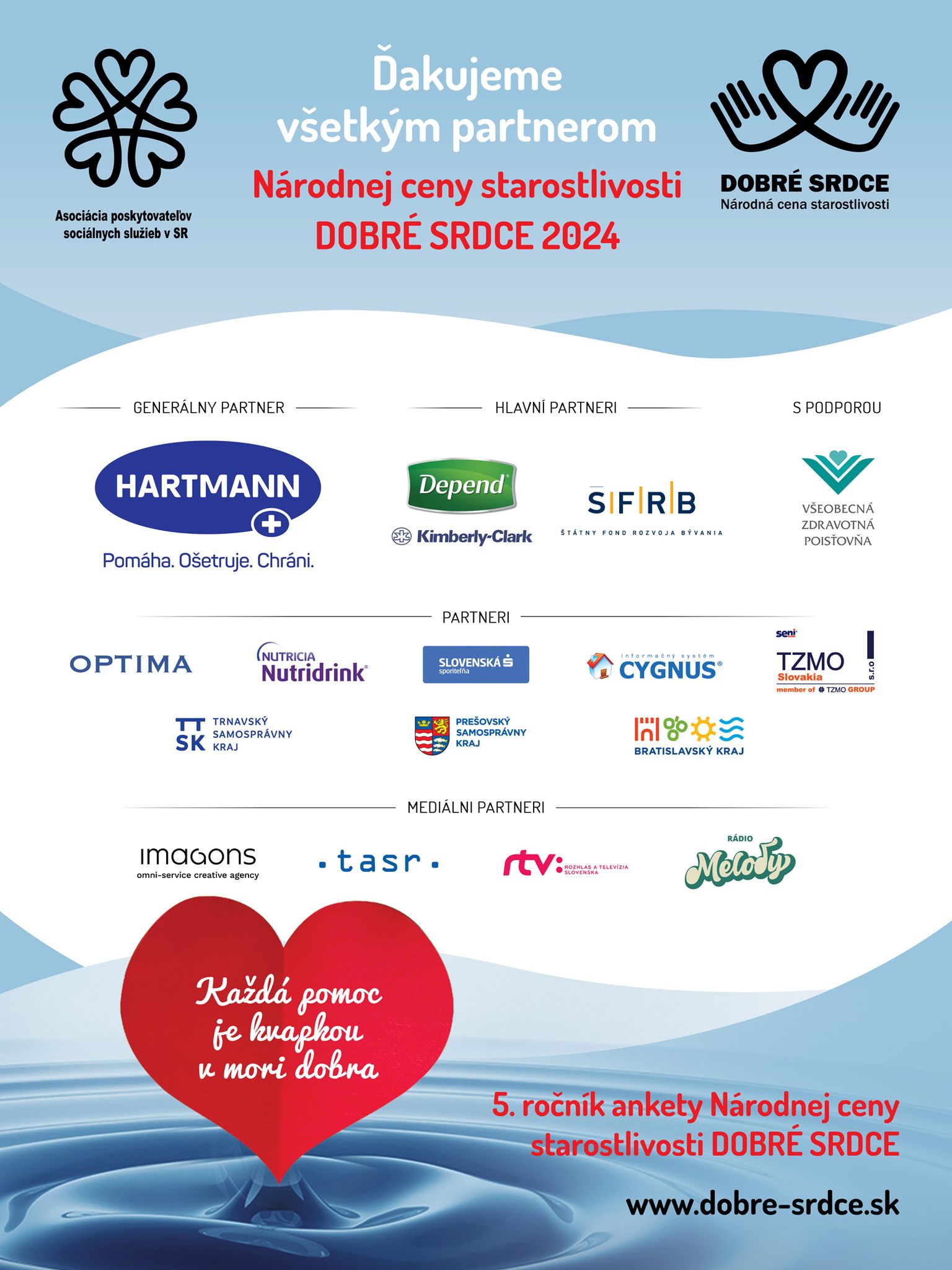 Do realizácie projektu Národnej ceny starostlivosti sa pridali aj spoločnosti Danone, Iresoft, Slovenská sporiteľňa, obchodný dom OPTIMA, TZMO Slovakia, Christeyns, Auonia a Professional support. Mediálnu podporu nám tento rok poskytla okrem STVR aj spoločnosť Imageons a rádio Melódie a TASR. Záznam z galavečera odvysiela STVR 6.10.2024 na Dvojke. Všetky informácie nájdete na https://www.dobre-srdce.sk/