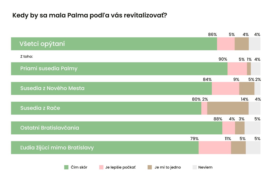 „Platí, že skorú revitalizáciu Palmy si želajú najmä tí, ktorí žijú neďaleko pripravovaného projektu. Z priamych susedov chce Palmu čím skôr oživiť 90 % opýtaných. Čakať ale nechce ani drvivá väčšina ľudí z Rače či iných častí Nového Mesta,“ hovorí Václav Hřích, managing director agentúry AKO.