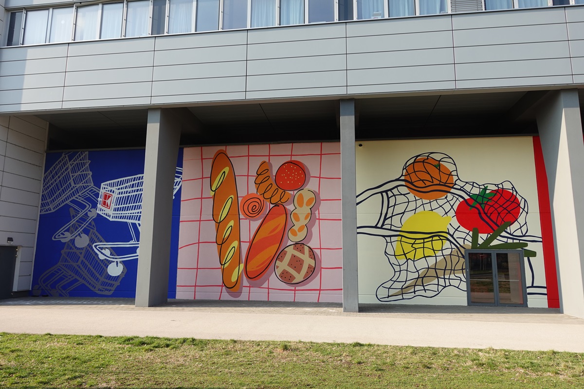 Na jednej zo stien sa rozprestiera výrazne modré pozadie, na ktorom sa jasne rysuje nákupný vozík ako okamžite rozpoznateľný symbol nakupovania. O kúsok ďalej hravé ilustrácie bagiet, žemlí a koláčov v teplých odtieňoch oranžovej a červenej kontrastujú so sieťkou na ovocie s čiernymi linkami. Nechýba ani pop-artový prvok v podobe ilustrácie baleného mäsa, na ktorom svieti čiarový kód a dobre známe logo. Na betónovom múre pri areáli vznikol dlhý mural plný postáv, ako sú skejtbordista, cyklista či basketbalista. Celé dielo pripomína vizuálnu kroniku mestského života, od športu a pohybu až po každodenné momenty, ktoré sa odohrávajú medzi prácou, nákupmi a voľným časom.