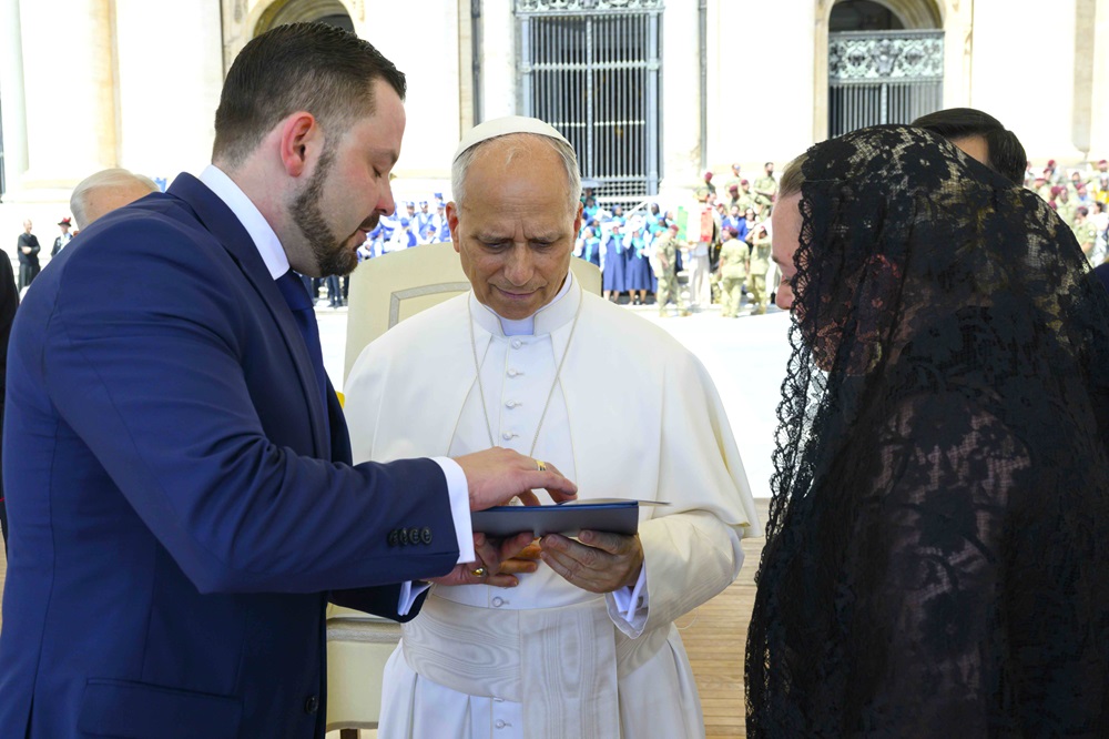 Pápež Lev XIV. pri prezeraní fotoalbumu z doterajších 20 rokov medzinárodných ekumenických aktivít Inštitútu NAPS vo Vatikáne v júni 2025. Foto: OLES CHERESKO