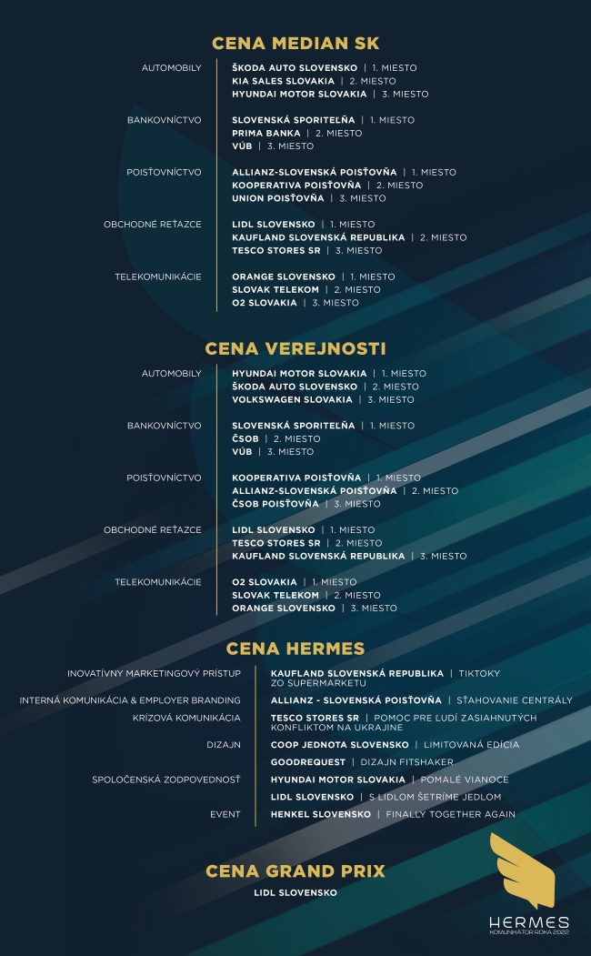 https://www.cenyhermes.sk/. V kategórii BANKOVNÍCTVO vyhrala Slovenská sporiteľňa. Kategóriu AUTOMOBILY, podobne ako pred rokom, vyhral Hyundai Motor Slovakia. V rámci kategórie TELEKOMUNIKÁCIE sa tentokrát ľuďom najviac páčila komunikácia O2 Slovakia. Medzi najlepšími poisťovňami uspela KOOPERATIVA poisťovňa a najlepšie komunikujúcim OBCHODNÝM REŤAZCOM sa stal Lidl Slovensko.